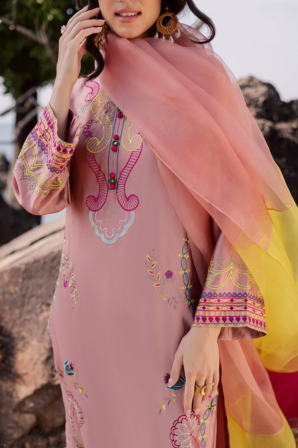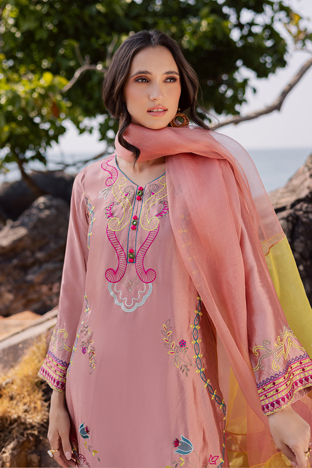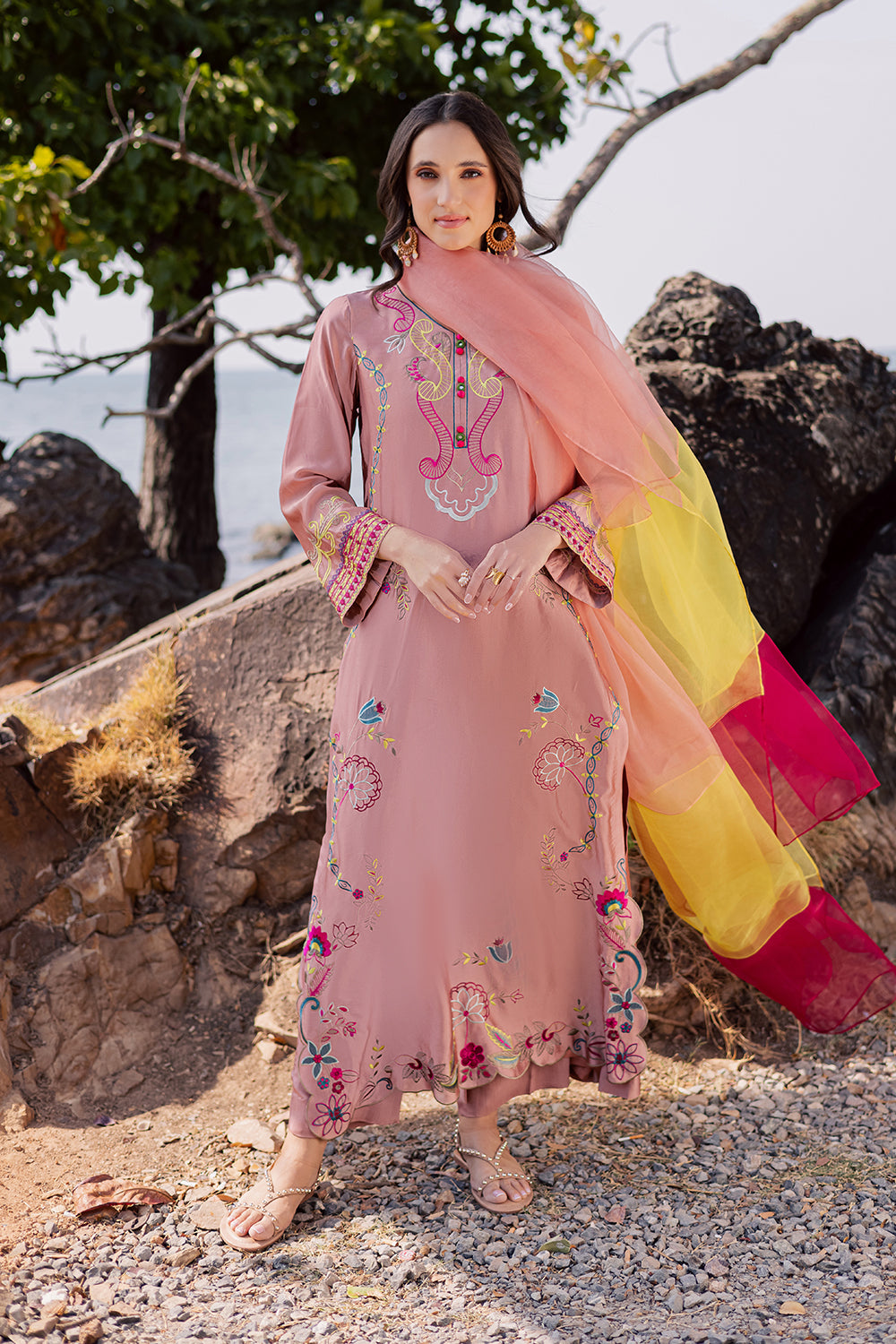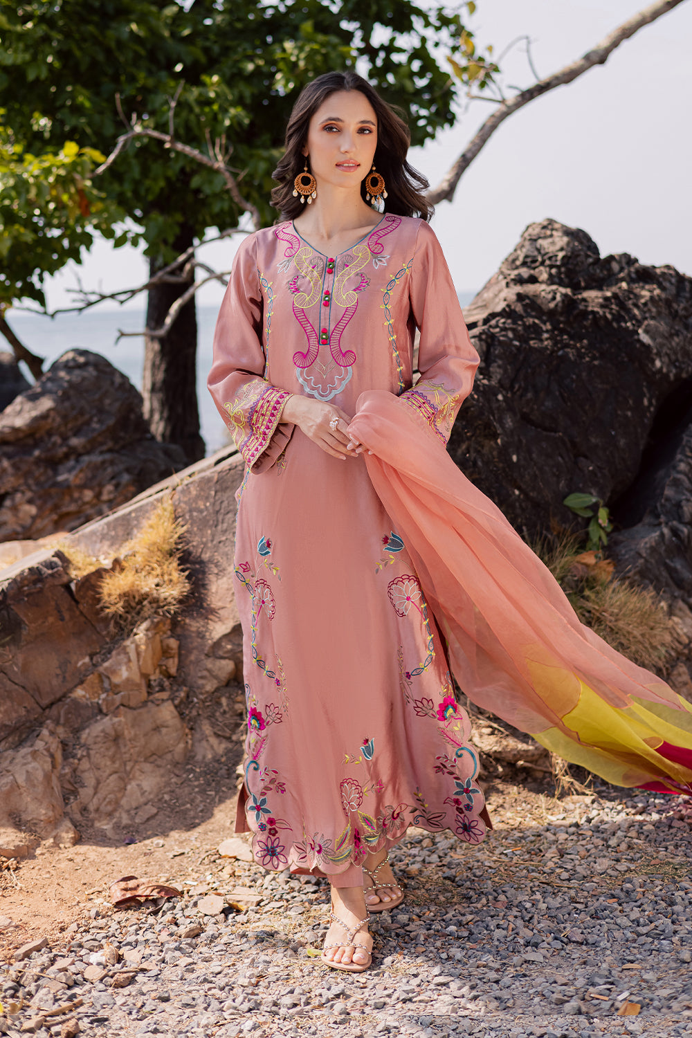 This high-quality Korean silk kaftan is adorned with elegant hand embroidery and appliqué detailing. It is paired with Korean silk trouser and an add-on pure organza dupatta, beautifully finished with three-tone appliqué work for a refined, graceful look.