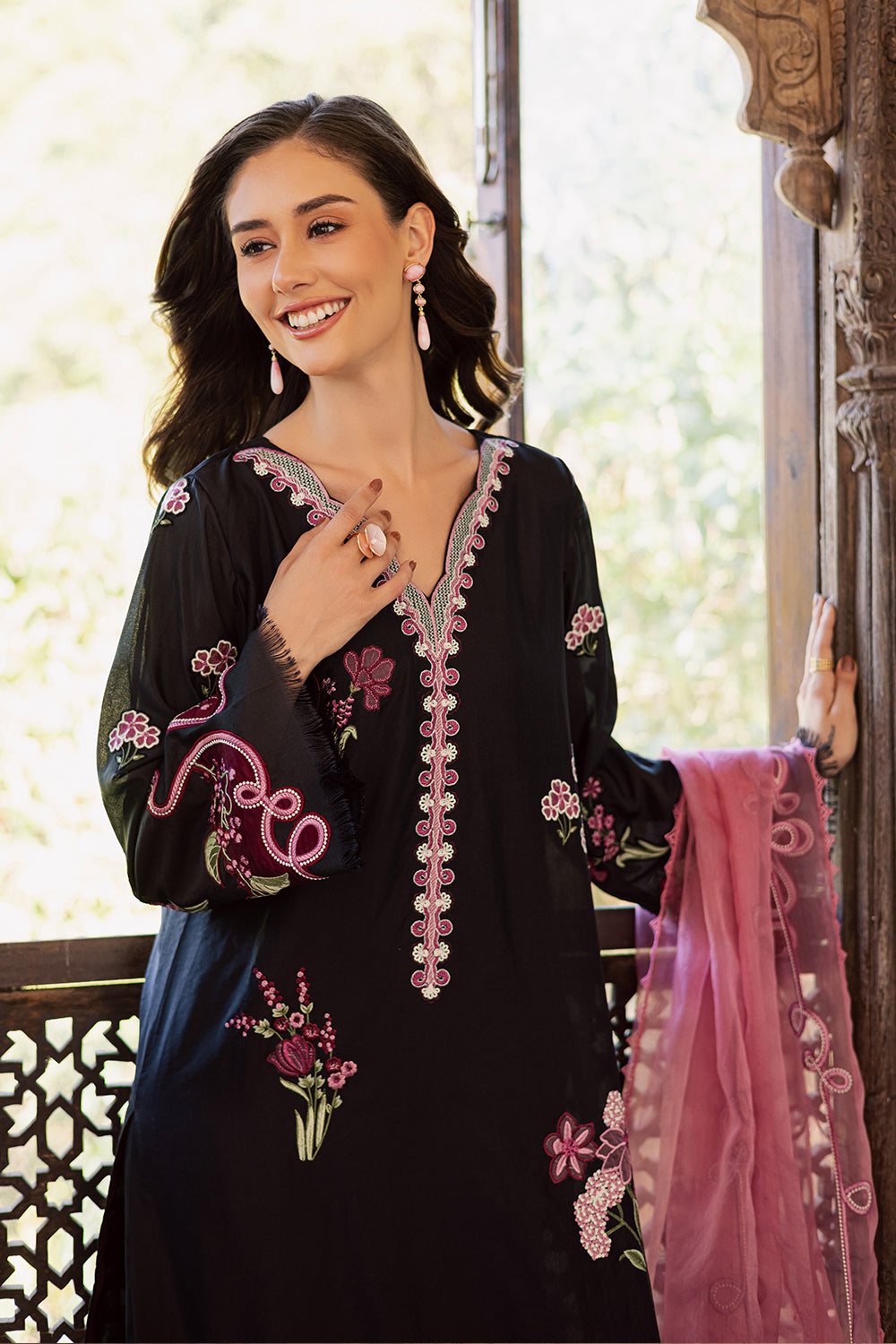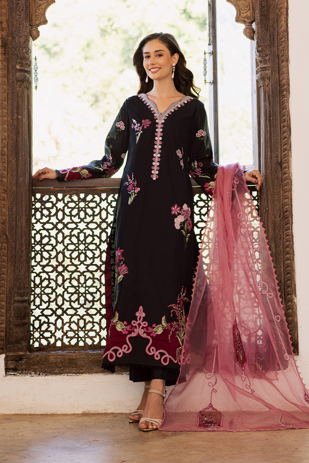This three-piece ensemble is crafted from imported Korean silk and paired with a soft, flowy pure organza dupatta. The shirt features elegant appliqué detailing on the front, sleeves, and back, while the dupatta is enhanced with delicate embroidery and appliqué work for a graceful finish.