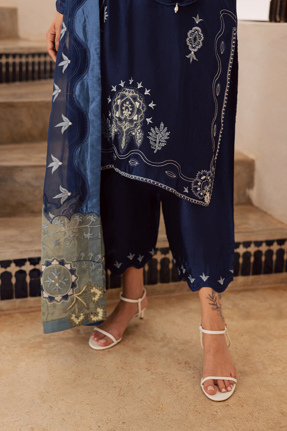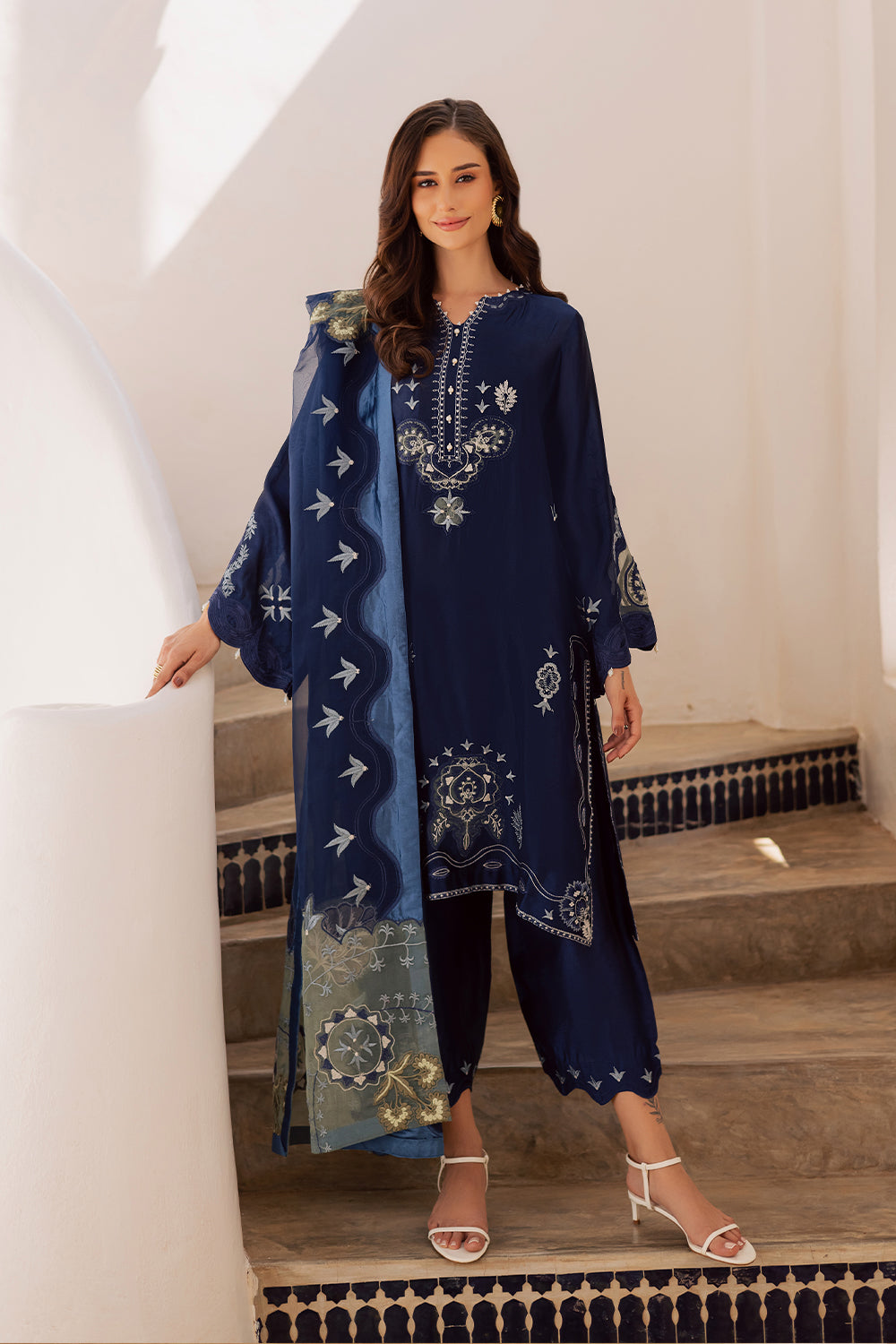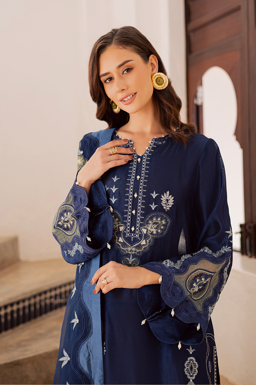 This outfit features a Korean fabric shirt and trouser, beautifully detailed with appliqué work and hand embroidery. It is paired with a 3-yard dupatta, finished with four-sided appliqué and embroidery for an elegant, complete look.