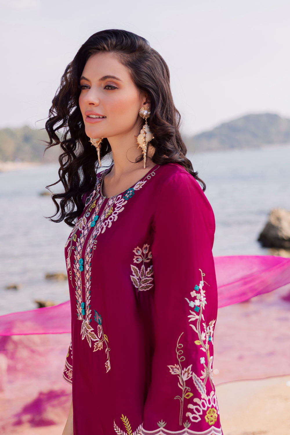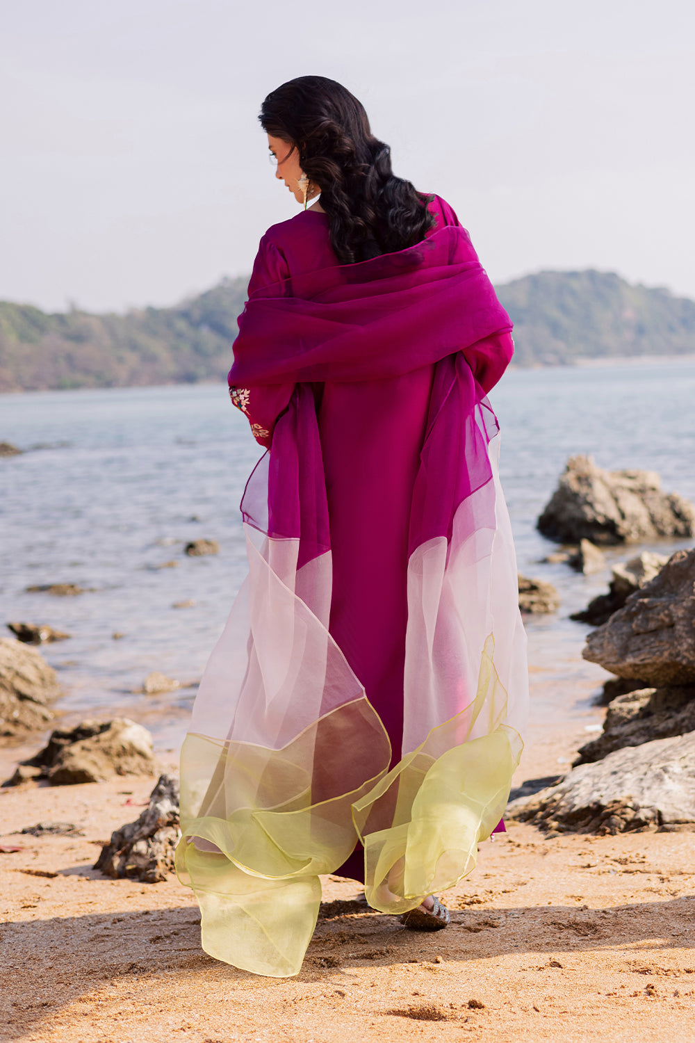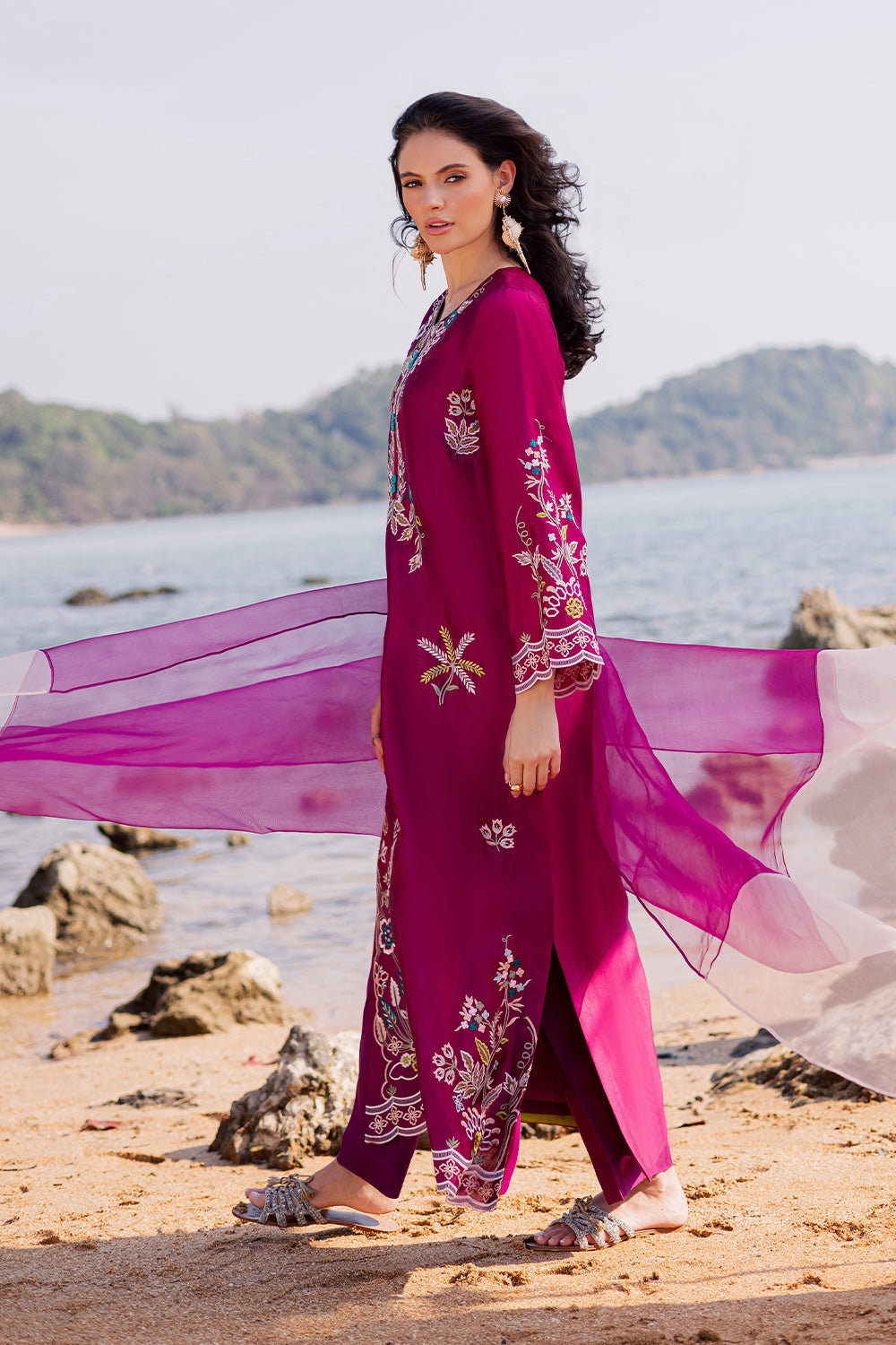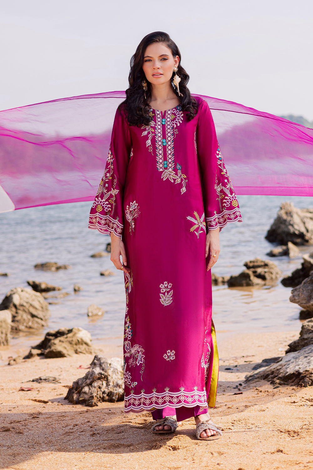 Crafted from imported Korean silk, this kaftaan features elegant appliqué work with delicate hand embroidery. It is paired with an add-on Korean silk trouser and a two-tone medium silk dupatta, completing the look with refined sophistication.