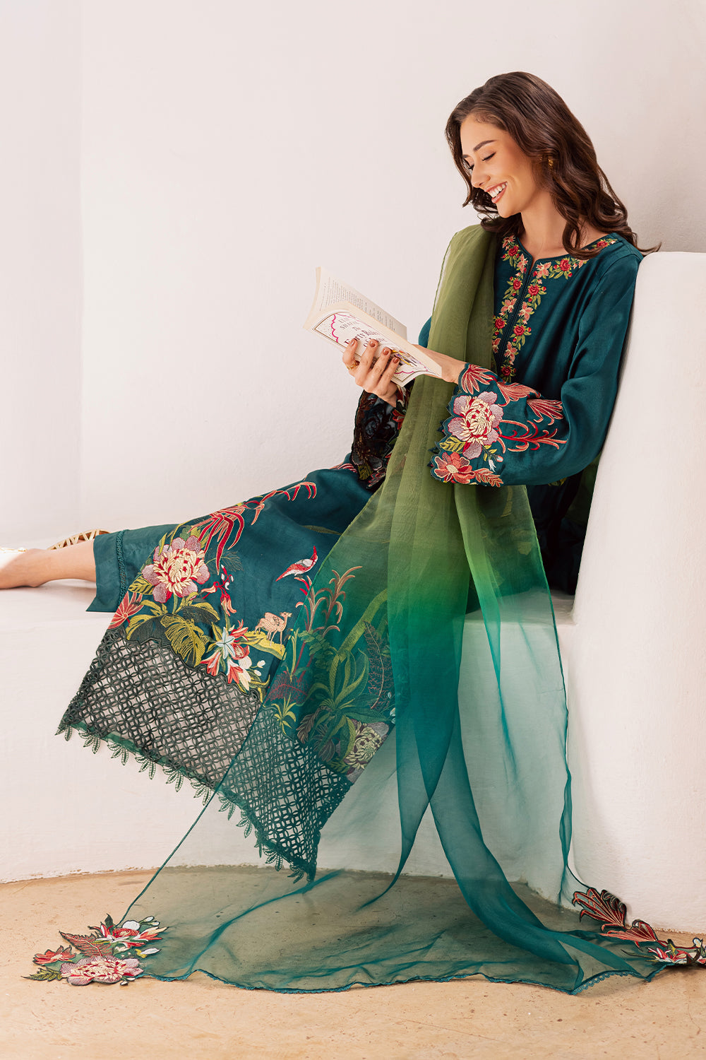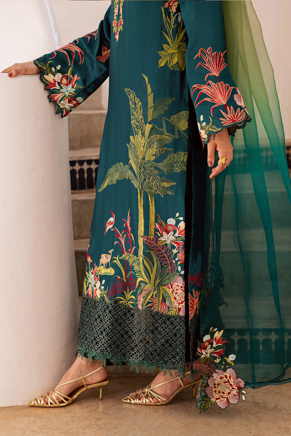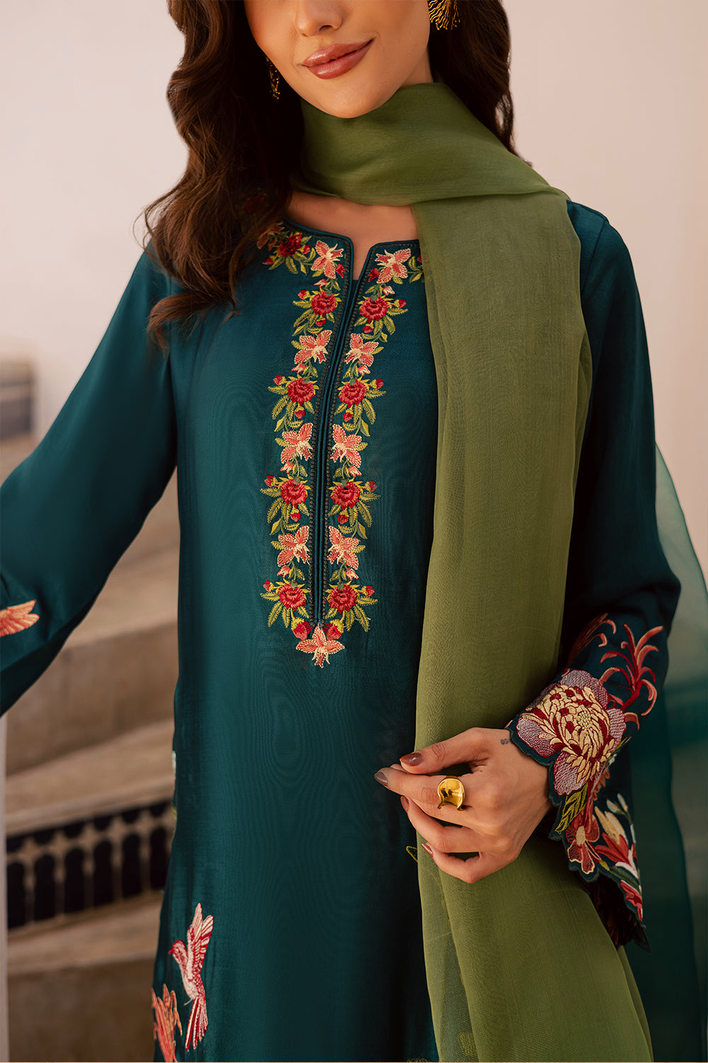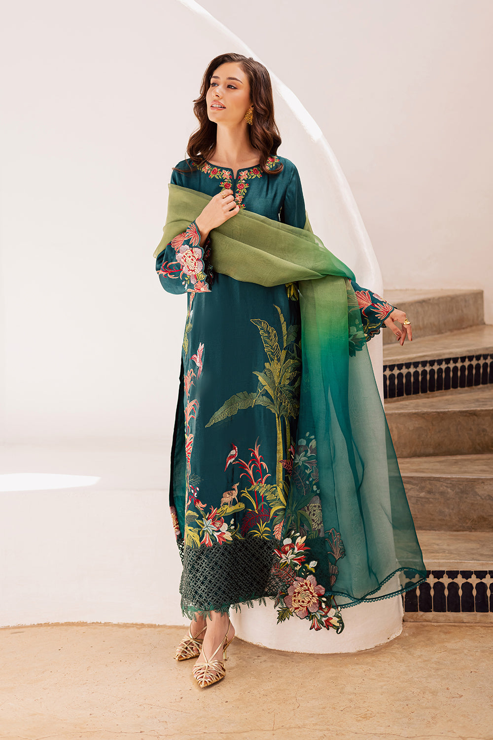 Crafted from imported Korean silk, this outfit features a fully embroidered shirt with detailed work on the back and sleeves, finished with delicate cutwork borders. It is paired with a 3-yard pure organza ombré dupatta, enhanced with elegant appliqué detailing.