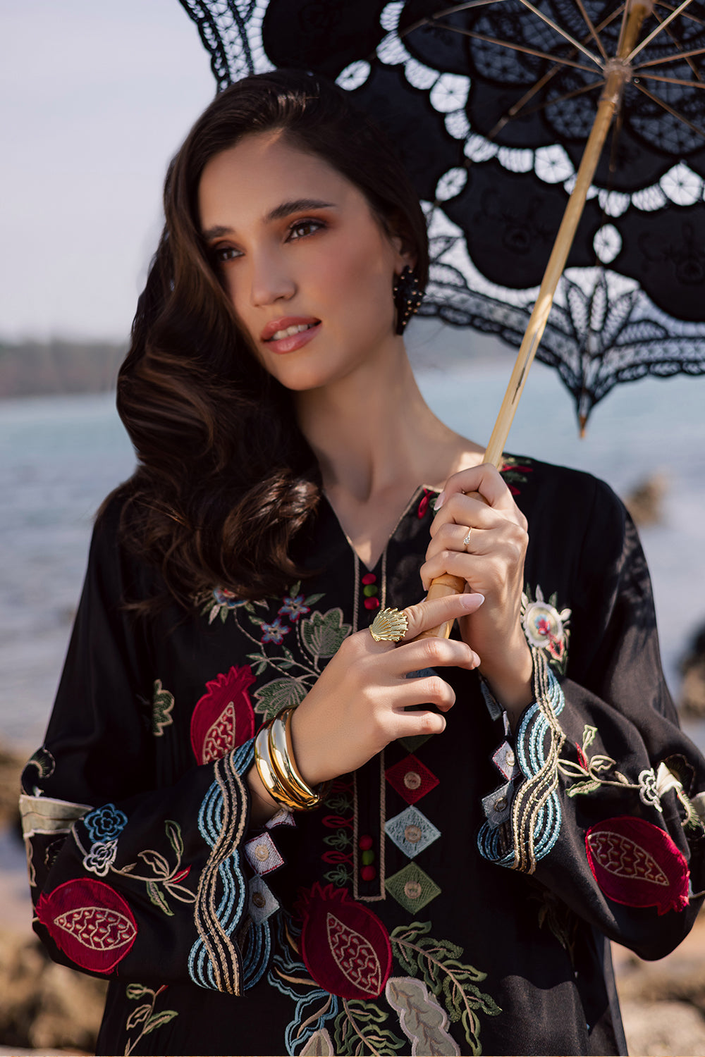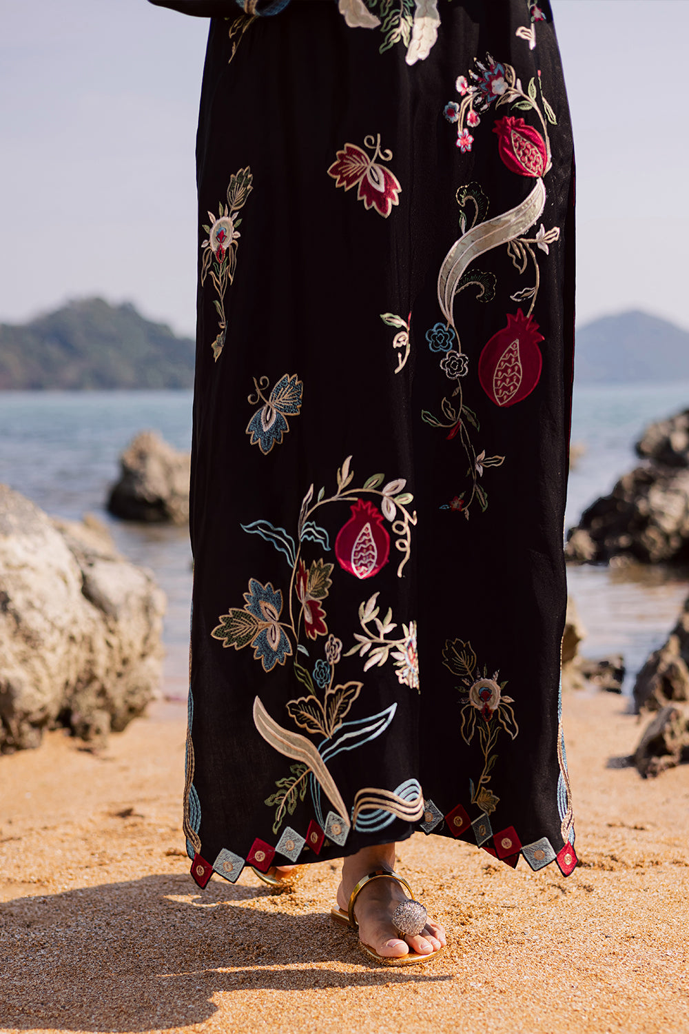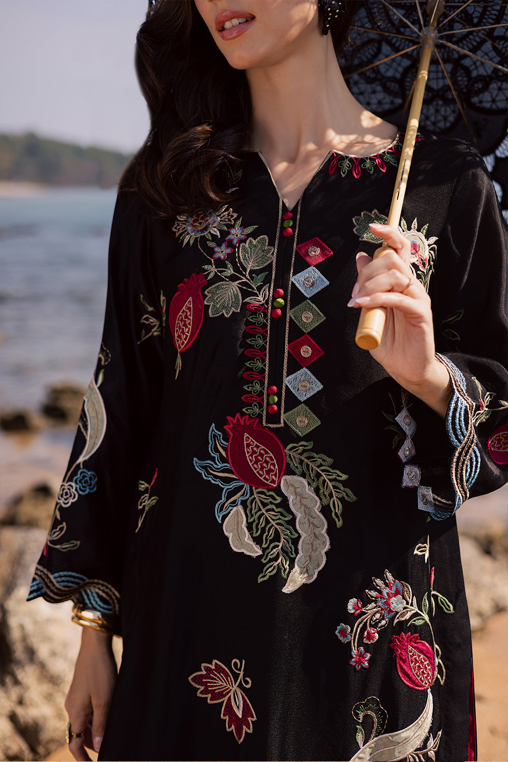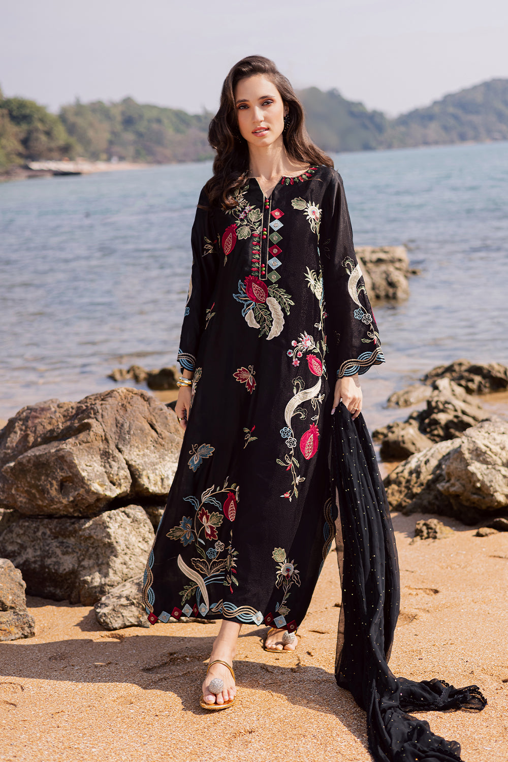 This black kaftaan is crafted from imported Korean silk, featuring refined appliqué work with delicate hand embroidery. It is paired with Korean silk trouser and an add-on chiffon dupatta, beautifully finished with mukesh detailing for an elegant touch.